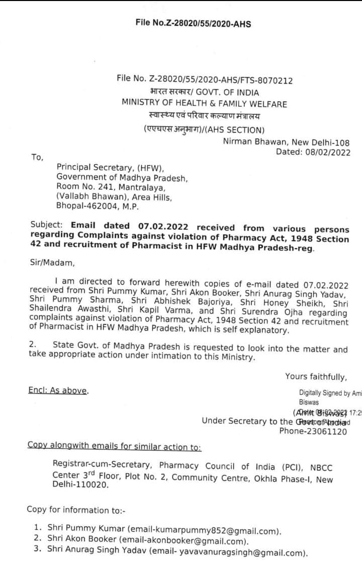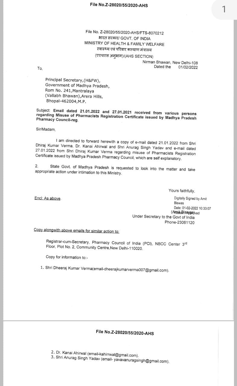 स्वास्थ्य सचिव को लिखे इस पत्र के संबंध में कृपया कार्यवाही करना सुनिश्चित करे ऐसे कई पत्र फार्मेसी काउंसिल ऑफ इंडिया द्वारा औषधि नियंत्रक भोपाल एवं रजिस्ट्रार मध्य प्रदेश राज्य फार्मेसी काउंसिल को लिखे गए लेकिन आज दिनांक तक कोई कार्यवाही नहीं की गई न ही इस संबंध में कोई जानकारी दी गई।