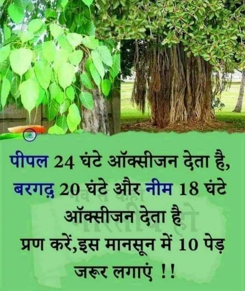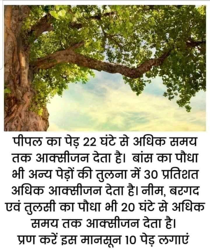 नीम पीपल और बरगद सबसे ज्यादा आक्सीजन देते हैं इसीलिए हमारे पूर्वजों ने इन्हें धर्म से जोड़ दिया था ताकि लोग इनकी पूजा करें , इन्हें जल दें और इन्हें अधिक से अधिक लगाएं ताकि हमें कभी प्राण वायु आक्सीजन की कमी न हो लेकिन हम आधुनिकता के चक्कर में अपनी महान सनातन संस्कृति को भूल गए हैं इसीलिए ईश्वर और प्रकृति ने हमें कोरोनावायरस जैसी महामारी में हमें आक्सीजन की कीमत बता दी है।