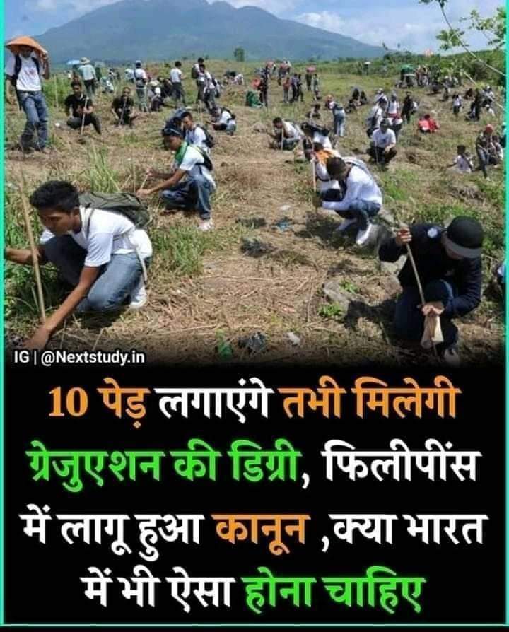 फिलीपींस में कानून लागू हुआ कि 10 पौधे लगाने पर ग्रेजूएशन की डिग्री मिलेगी। ऐसा हमारे देश में भी होना चाहिये।
