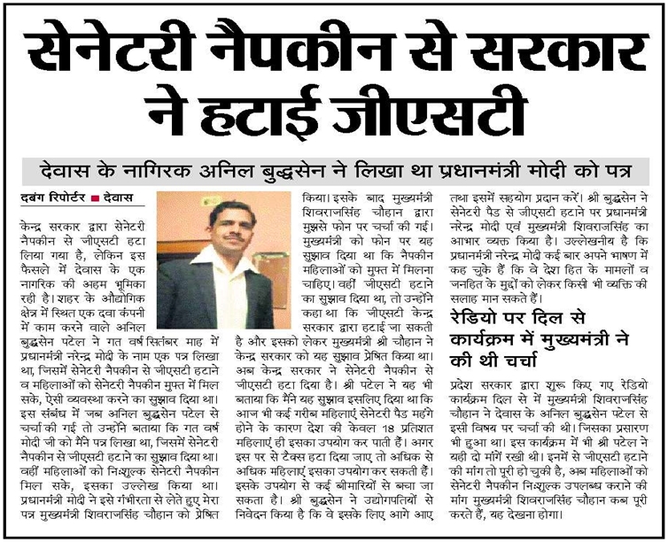 श्रीमान प्रधानमंत्री महोदय को सेनेटरी नैपकिन Tax free करने का दिया गया सुझाव ।सुझाव पर अमल करते हुए