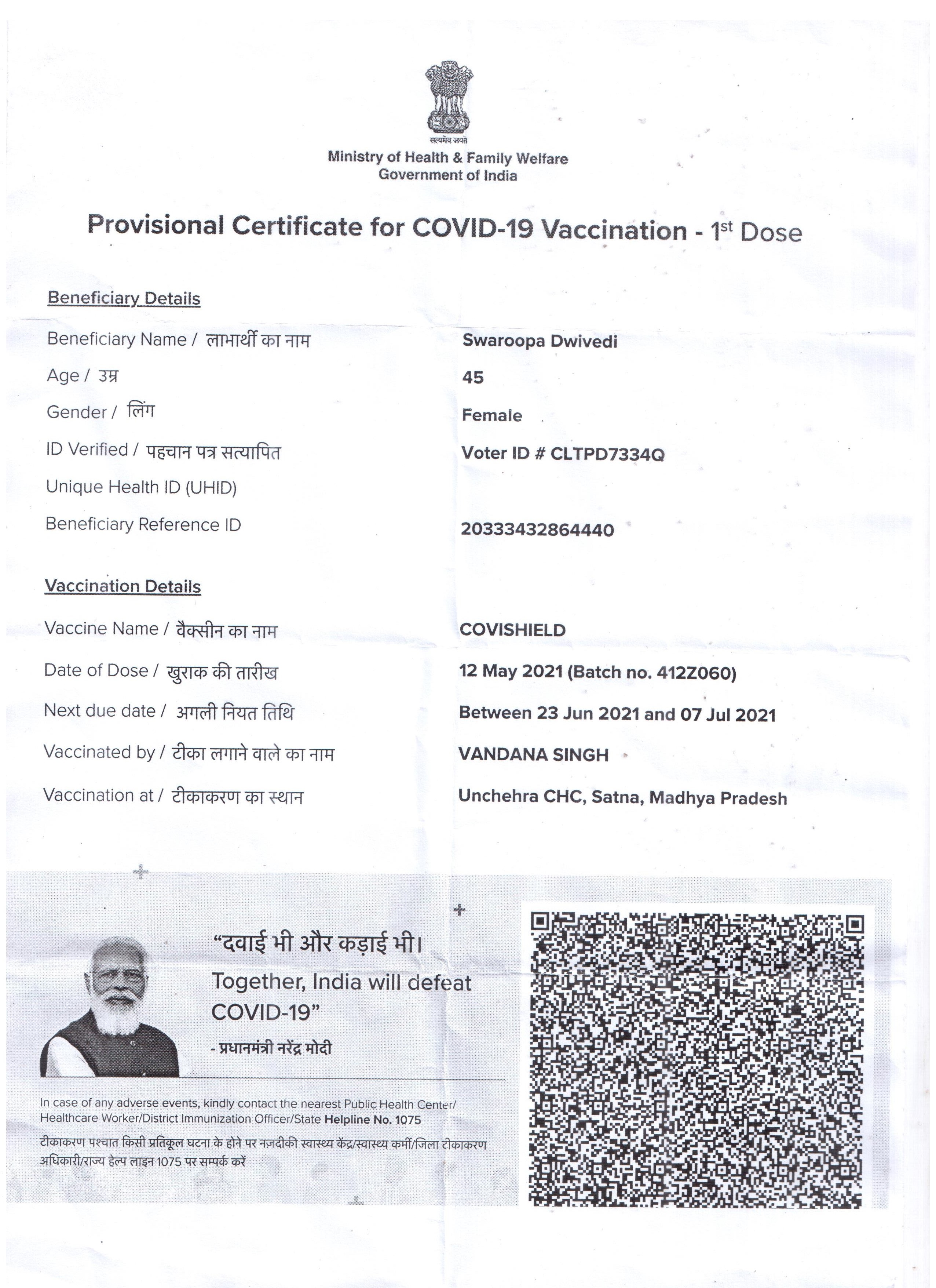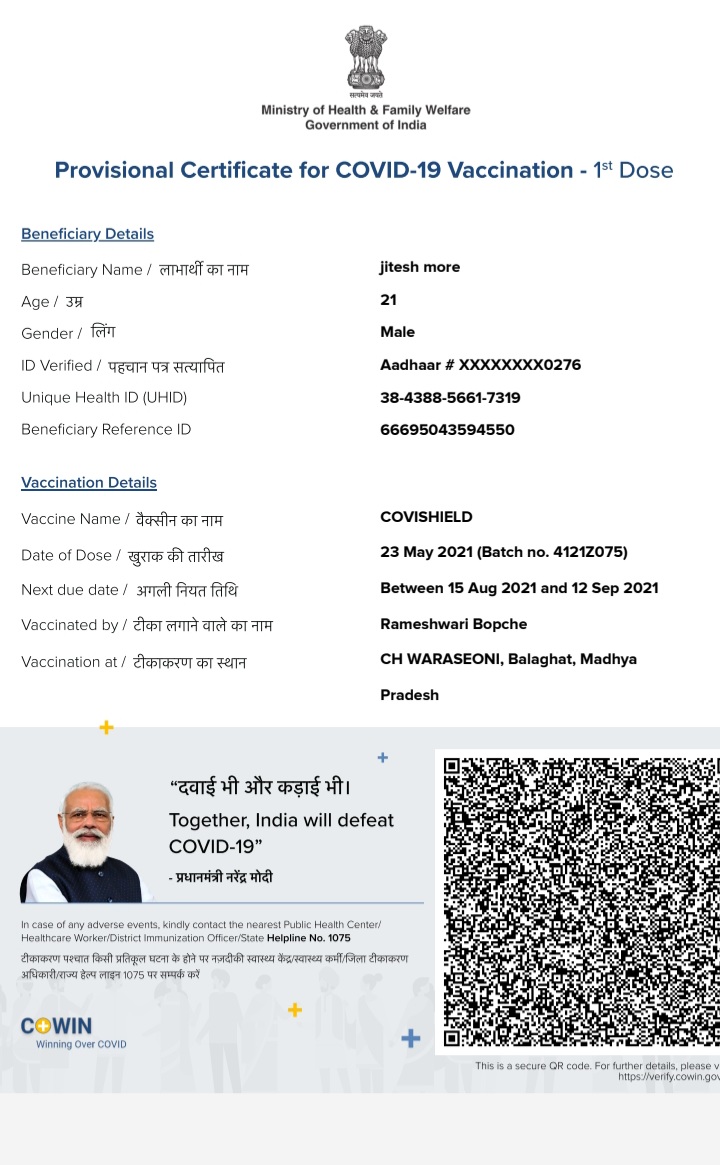 Aaj maine vaccine ki 1st dose lgaya hu our mujhe kisi bhi prakar ka bukhar nhi aaya mai swasth hu our mai desh ke sbhi 18+ bhaiyo our bheno se nivedan hai ki vaccine lgaye ye hme Corona mhamari se ladhne me madhad milegi