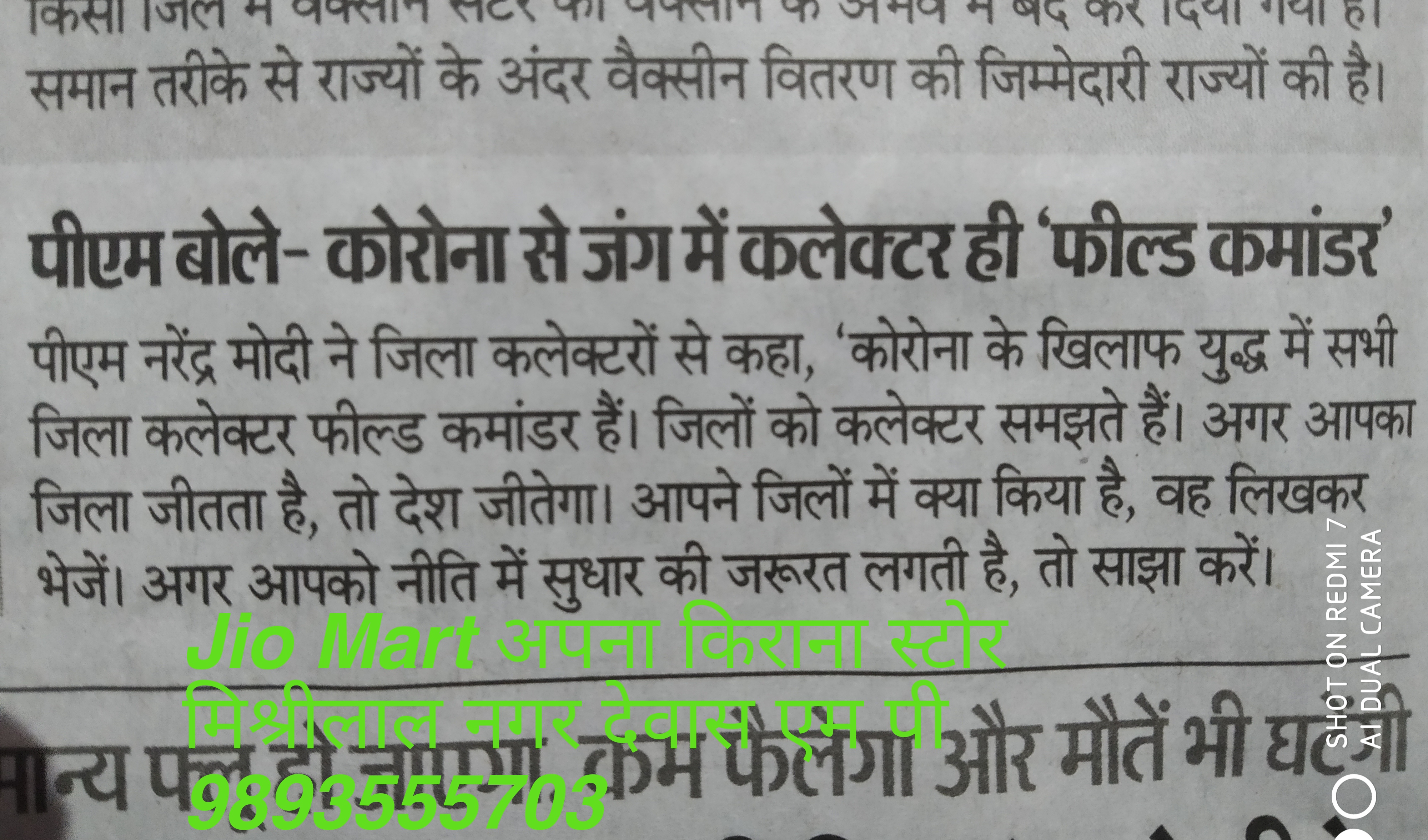 ResSirM.Pका औधोगिक शहर देवास के जिला कलेक्टर पुलिस अधिकारी केअथक प्रयास से,कोरोंना संक्रामण कीGroth Rateकम समय में नियंत्रित करने में सफल रही हैAकोरोना कर्फ्यू का पालनBक्राइसिस मैनेजमेंट के सिफारिस से दुकानों का लॉकडॉनCदेवास के नागरिकों को कोरोना बचाव के लिए तैयार करनाDकोरोना मरीजों को समय पर ईलाज उपलब्ध कराने जैसे उपाय से देवास प्रशासन प्रशंसा का पात्र हैं।