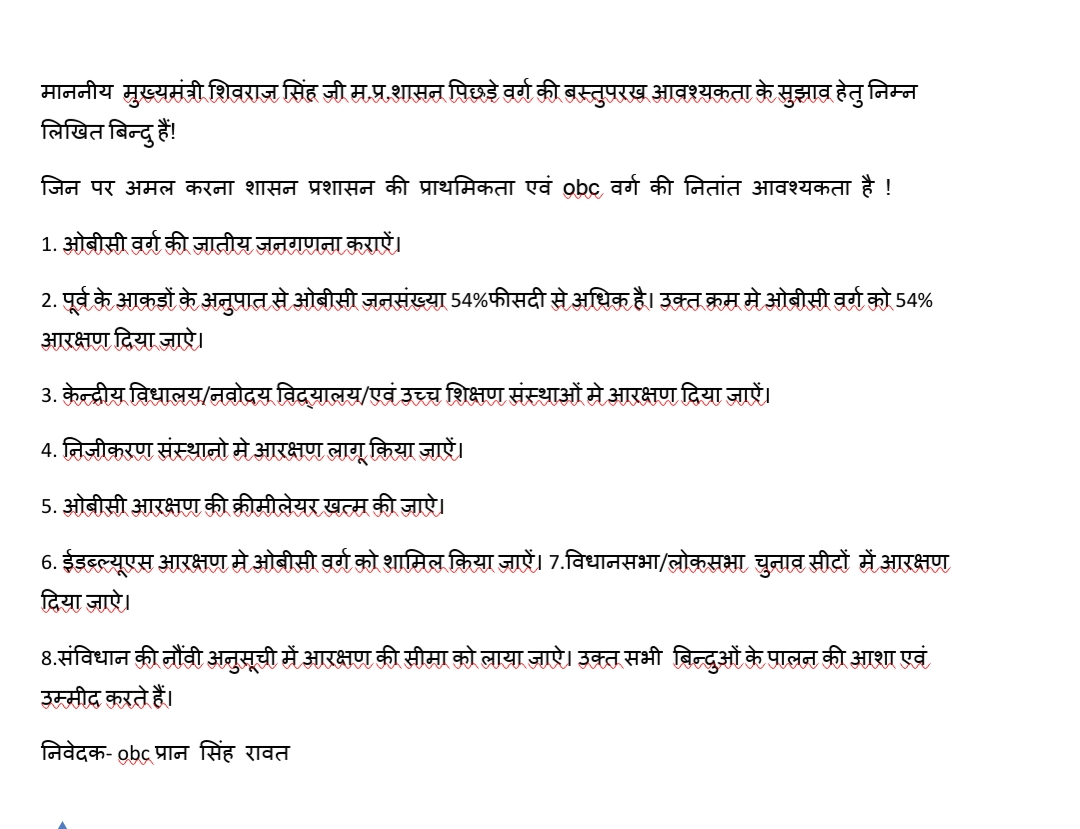 सम्मानीय मुख्यमंत्रीजी आपसे निवेदनहै किobcकीवर्तमानस्थिति