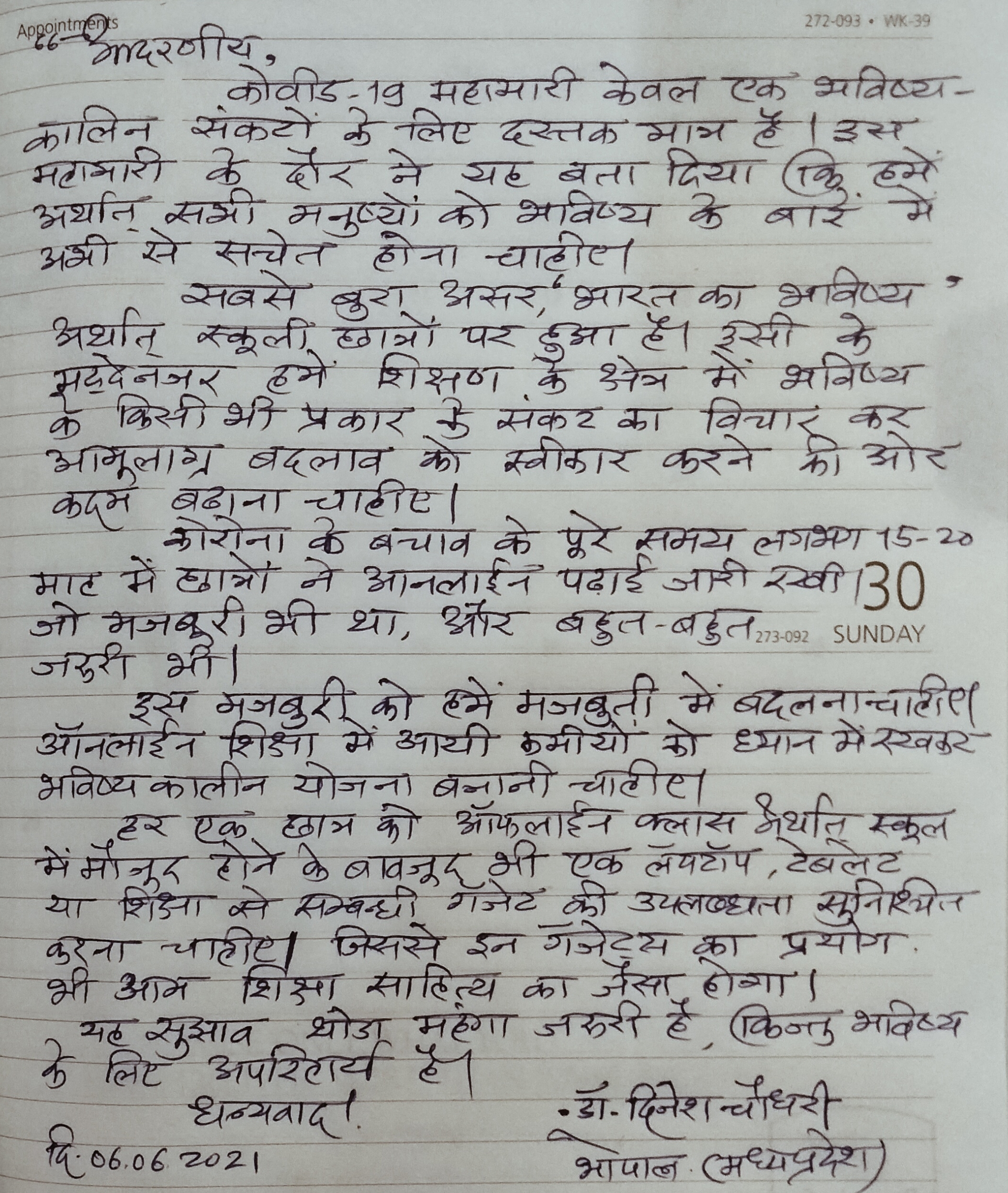 Sir,Looking at the current scenario and prediction for 3 wave which will be harmful to children,it's my suggestion not to start the schools before August. June and July can be continued online. Any decision taken in hurry marbhave seriious repercussions. Even if a 1 child get infected in class, all students, teachers and staff will be infected. Moreover, variant of covid these days are not diagnosed with by simple fever, cough and cold.
