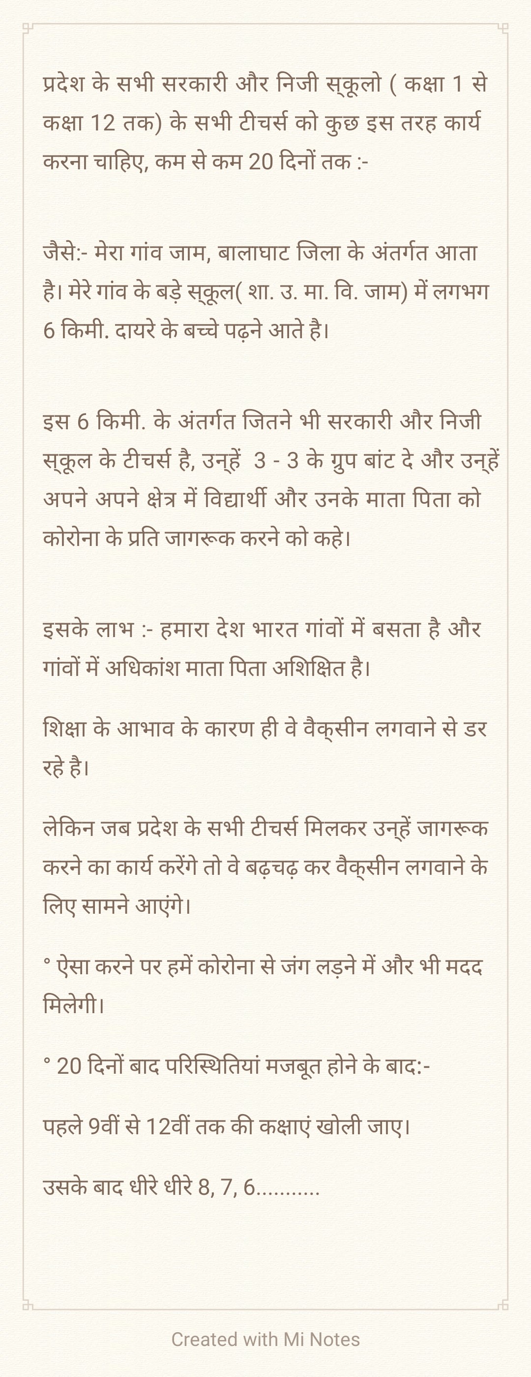 मेरे हिसाब से 9 से 12 तक की कक्षाए 1 सितम्बर से स्टार्ट करना चाइए वो भी सप्ताह मे 3 दिन और ये अभिभावक की लिखित अनुमति से स्कूल मे प्रवेश दिया जाना चाइए और वो बच्चे जिनके perents ने टिका करवा लिया वो ही स्कूल मे आये और बाकी सप्ताह के 2 दिन ऑनलाइन assignment,quiz,gk और practically उनको ऑनलाइन क्लास मे समझाया जाए।
