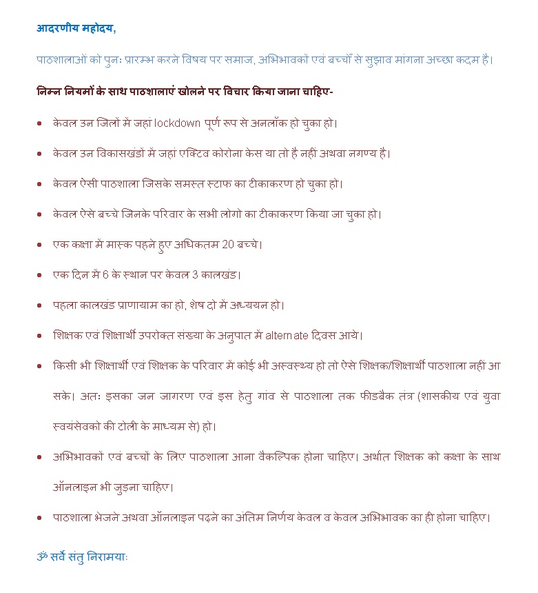 1july se school start ho jana chahiye agar sakraman badhe to us area me band karke kuchh samay online ke sath chale.suraksha ko dekhte hue sabhi teachers ki complasary vaccination ho