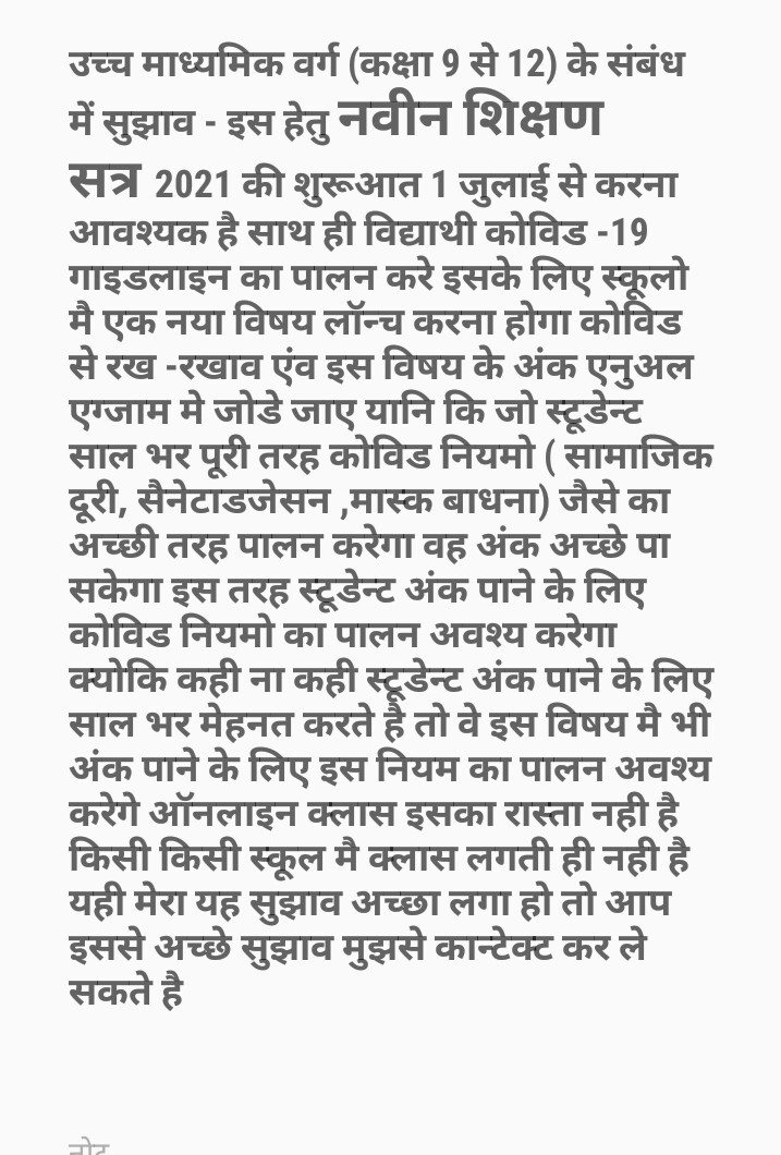 उच्च माध्यमिक वर्ग (कक्षा 9 से 12) के संबंध में सुझाव - इस हेतु नवीन शिक्षण सत्र 2021 की शुरूआत 1 जुलाई से करना आवश्यक है साथ ही विद्याथी कोविड -19 गाइडलाइन का पालन करे इसके लिए स्कूलो मै एक नया विषय लॉन्च करना होगा कोविड से रख -रखाव एंव इस विषय के अंक एनुअल एग्जाम मे जोडे जाए यानि कि जो स्टूडेन्ट साल भर पूरी तरह कोविड नियमो ( सामाजिक दूरी, सैनेटाडजेसन ,मास्क बाधना) जैसे का अच्छी तरह पालन करेगा वह अंक अच्छे पा सकेगा इस तरह स्टूडेन्ट अंक पाने के लिए कोविड नियमो का पालन अवश्य करेगा क्योकि कही ना क