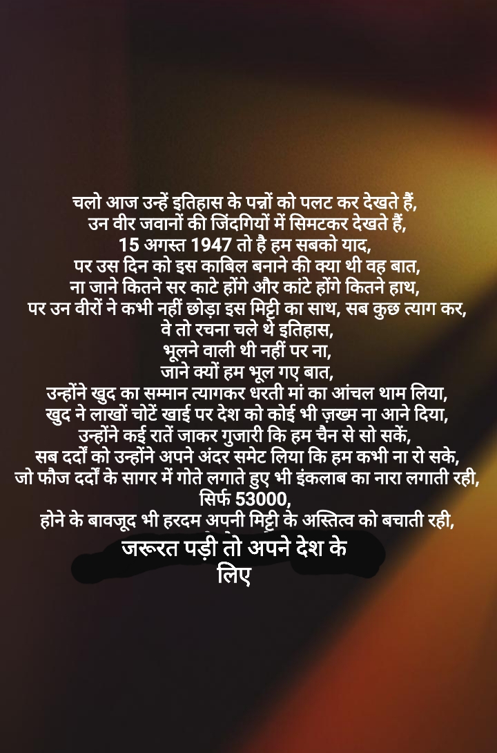 हम याद करें उन वीरों कि जिसके चलते भारत हुआ महान,हम उनके हौसले को,साहस को करते सलाम जिसके चलते भारत हुआ आजाद।।