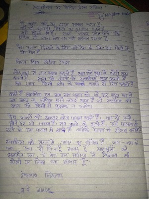 स्वतंत्रता एक पुकार है।यह पुकार है भारत माता की अपने बीर सपूतों के प्रति।जिस की जवाब में कई नजवान आे ने अपने प्राणों कि आहुति दे दिया थी।लेकिन ये हमें जरूर मानना ही होगा कि हम अभिबी पूर्ण स्वराज नहीं पाए है।हम अभी वी मानसिक और बेबहारिक दिक से गुलाम है।अगर हम अपने जीवन में स्वदेशी का मंत्र अपनाए और देश हित से जुड़े हर एक फैसले लेने से पहलेचाहे आे बेक्तिगत हो याफीर अंतरराष्ट्रीय, अपने शहीद आे के बीर बलिदान को ध्यान पे रख कर अपने हर एक फैसले लेतो हमें पूर्ण स्वतंत्र और आत्मनिर्भर अवश्य ही होंगे।