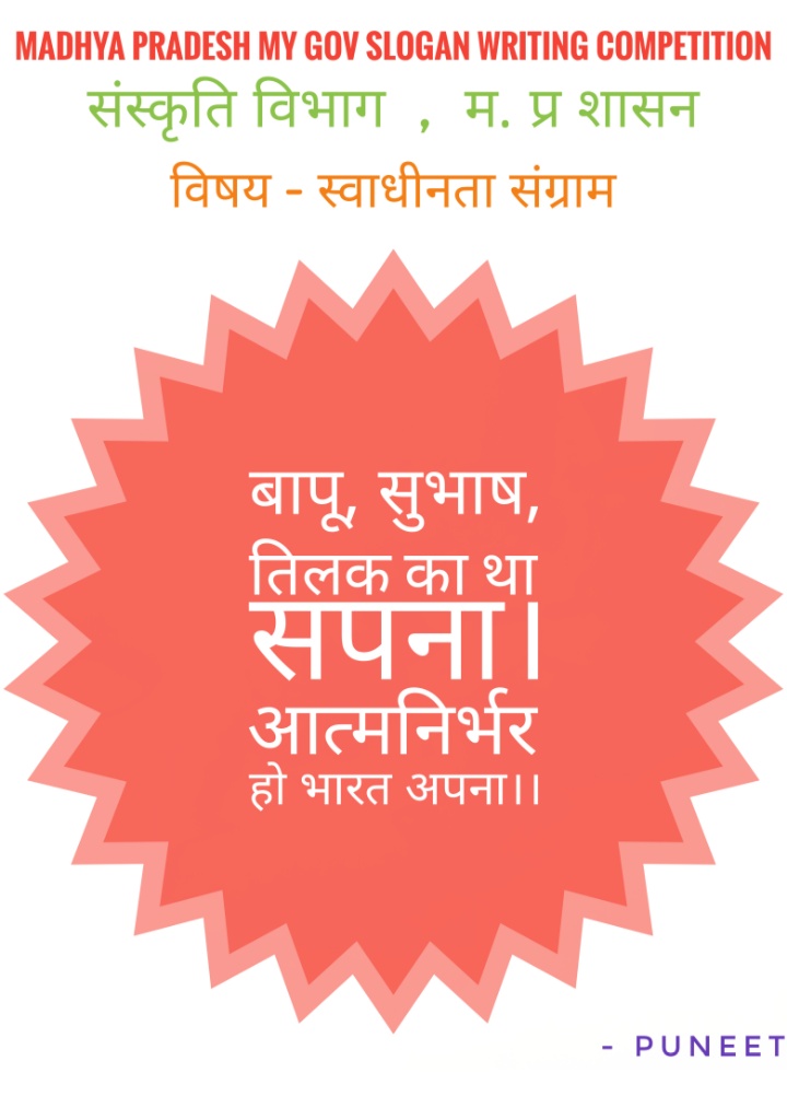 प्रदेश के युवाओं, विद्यार्थियों और बच्चों में स्वाधीनता संग्राम के प्रति जागरूकता उत्पन्न करने के उद्देश्य से मध्य प्रदेश के सभी कक्षा 9वीं से 12वीं तथा स्नातक एवं स्नातकोत्तर स्तर के महाविद्यालयीन विद्यार्थी के लिए स्वराज संस्थान संचालनालय, संस्कृति विभाग म.प्र. शासन द्वारा स्वाधीनता पर केन्द्रित प्रेरक स्लोगन लेखन प्रतियोगिता का आयोजन किया जा रहा है।