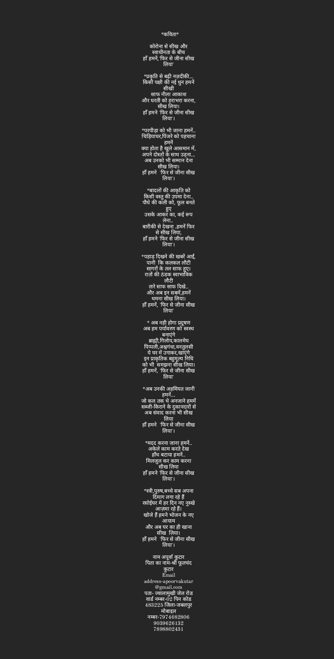 Email address-apoorvakutar @gmail.com