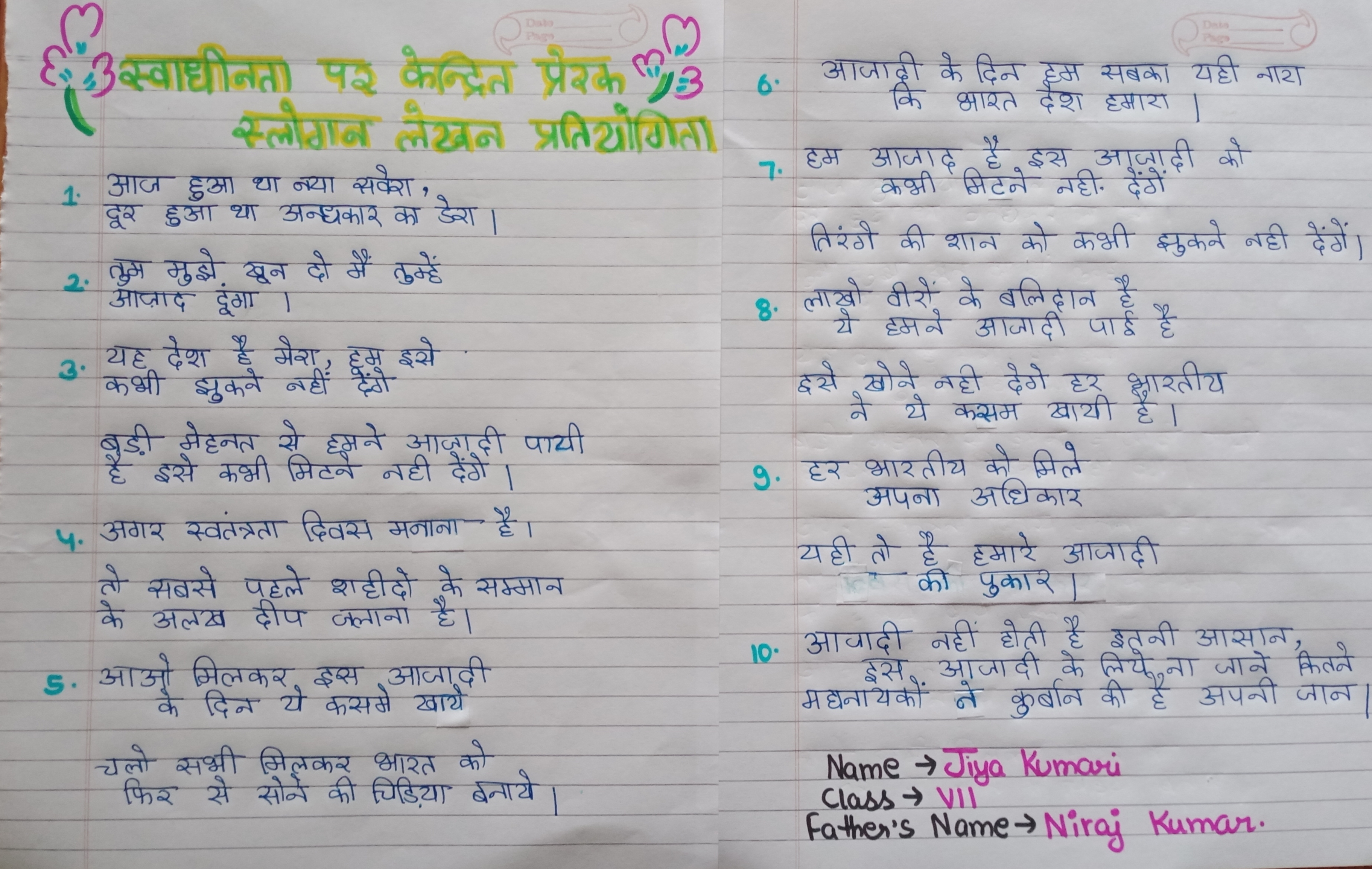 स्वाधीनता पर केन्द्रित प्रेरक स्लोगन लेखन प्रतियोगिता