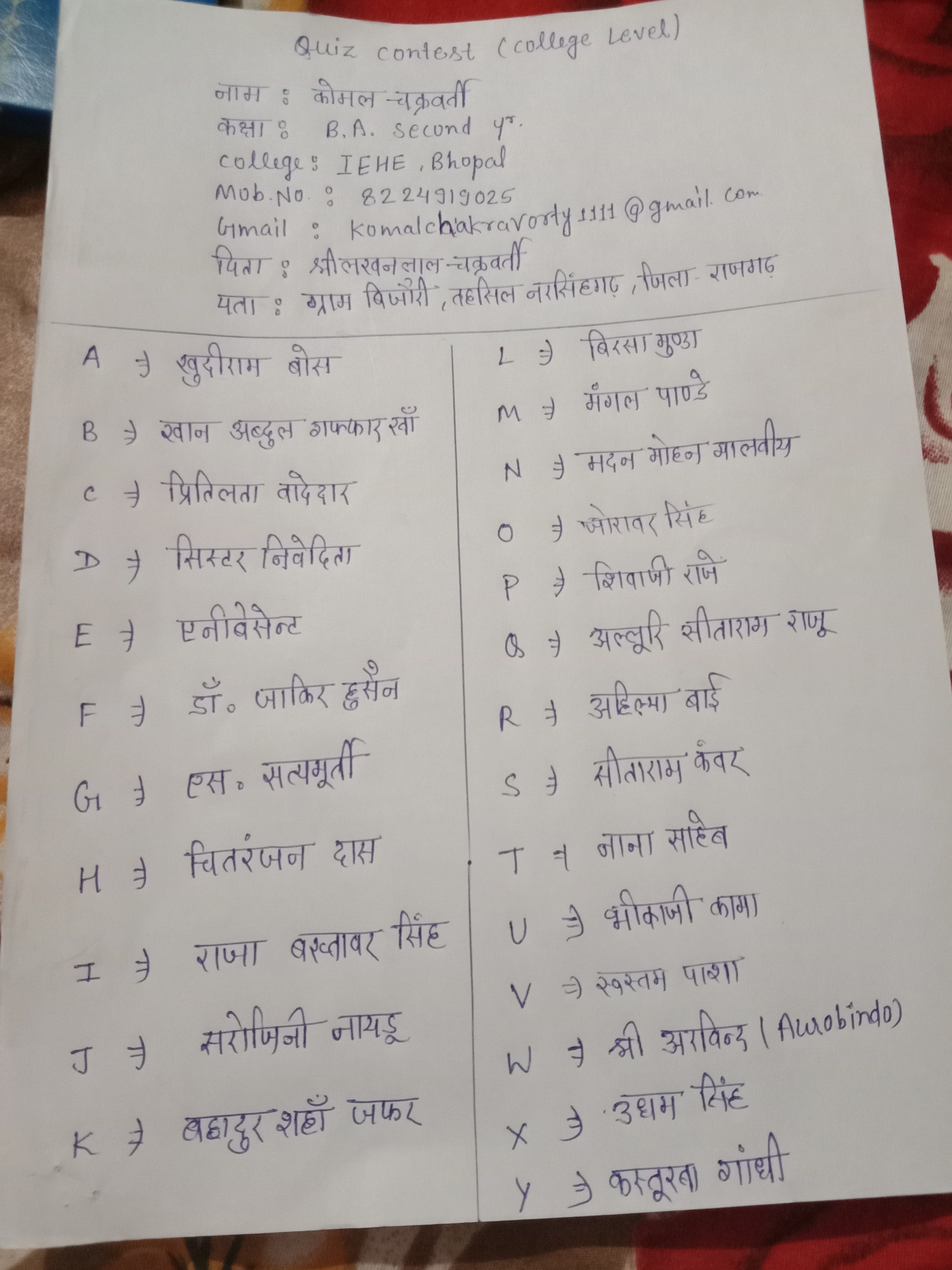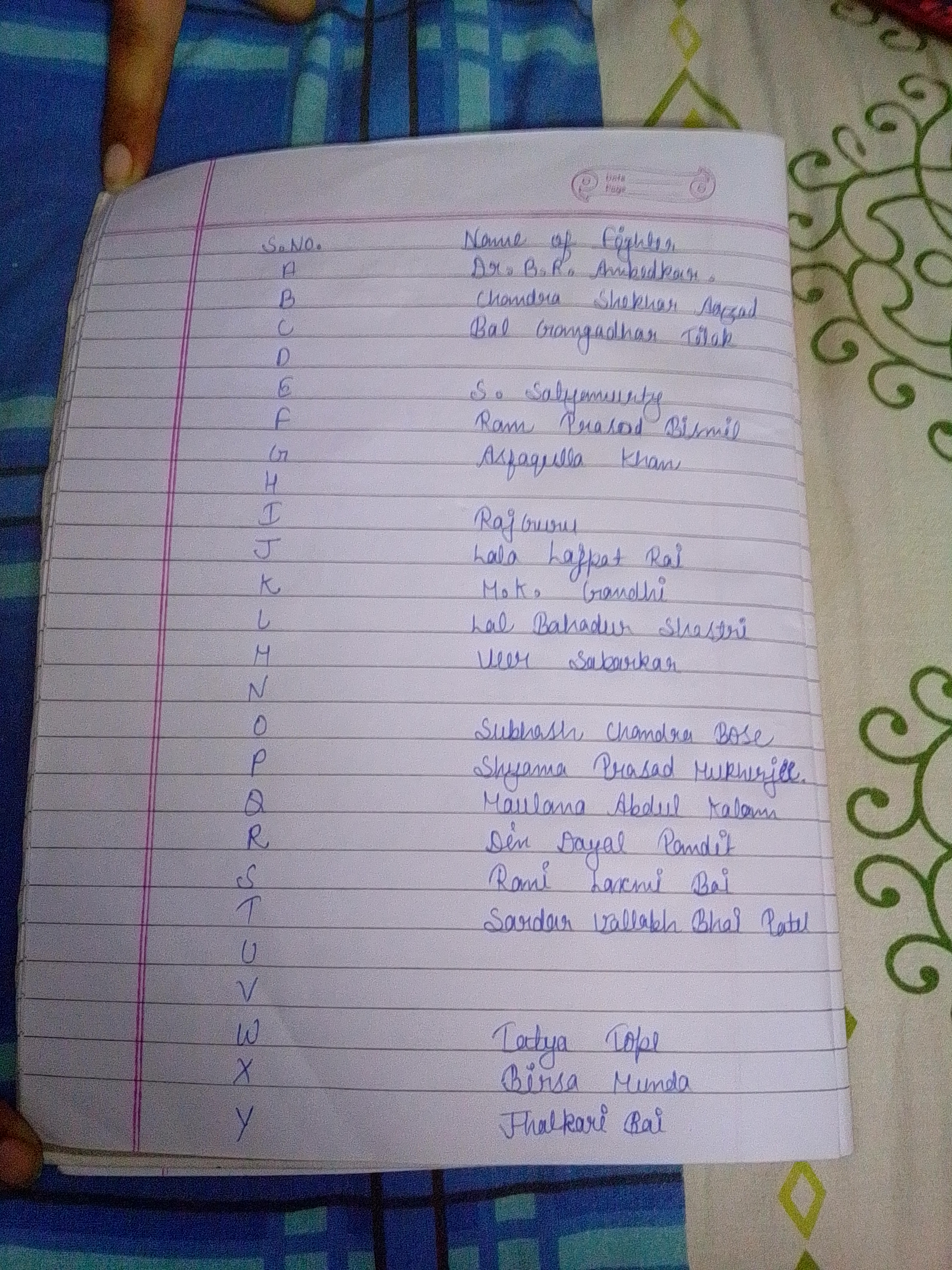 A-भीम राव अम्बेडकर,B-chandrashekharआजाद,C-बाल गंगाधर तिलक,E-मौलाना मोहम्मद बरकतउल्ला, F-R P बिस्मिल,G-असफाक उल्ला खान,H भगतसिंह, I सुखदेव,J ललालजपत राय,K महात्मा गाँधी, L लालबहादुर शास्त्री, M विपिनचन्द्र पाल, N सरोजनी नायडू, O सुभाष चंद्र बोस, Q मौलाना अब्दुल कलाम आजाद, R खुदीराम बोस,S लक्ष्मी बाई,T sardarpatel, U अवंती बाई, V टंटया भील,W तात्या टोपे,X बिरसा मुंडा,Y अहिल्याबाई,