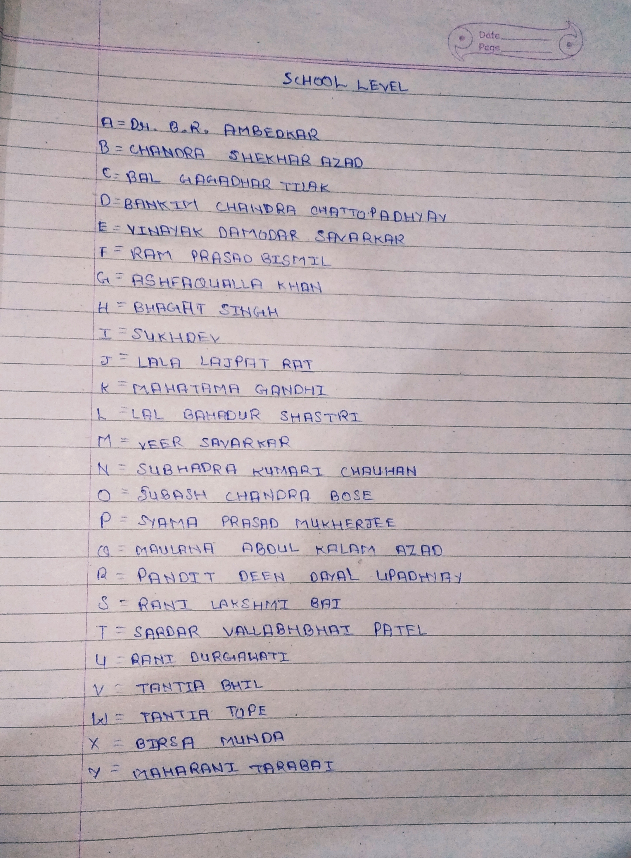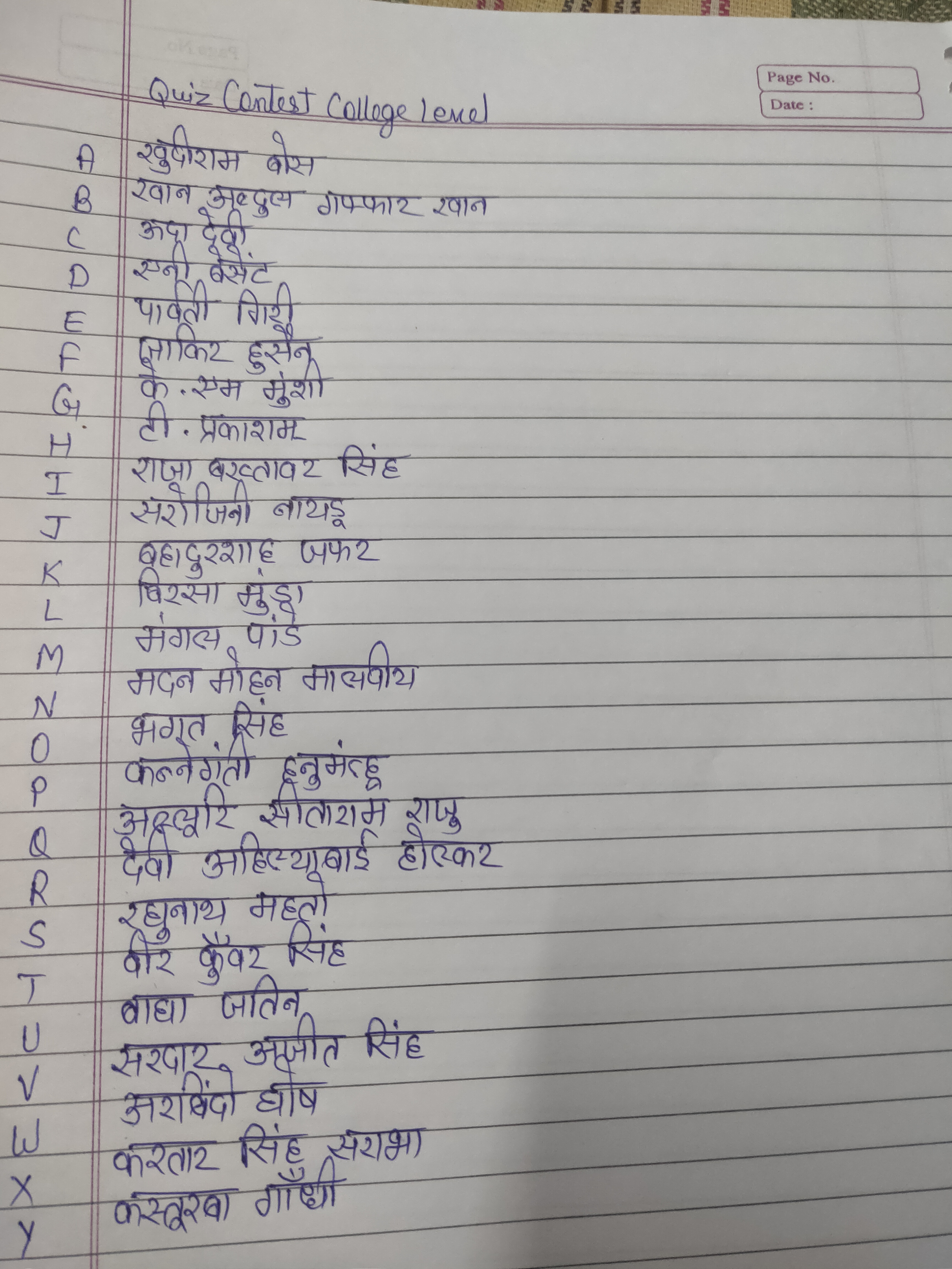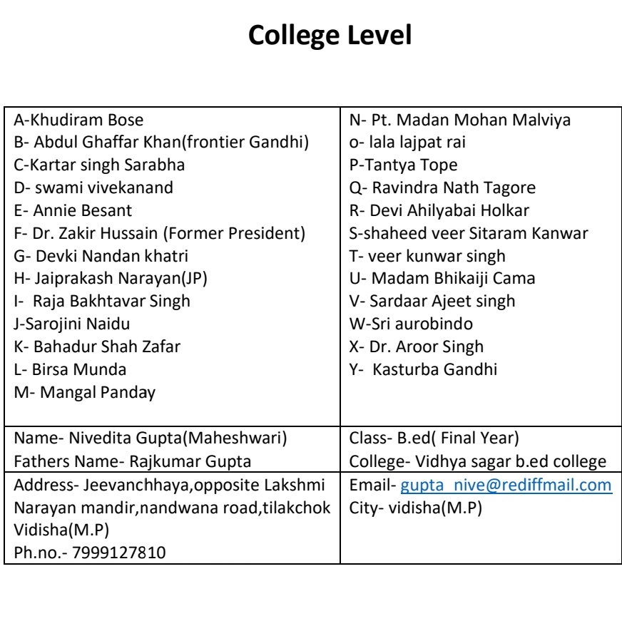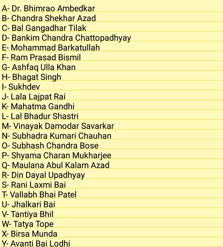A.) Dr. Ambedkar b.)Chandrasekhar aazad, c.) bal gangadhar tilak, d.)bankim Chandra chatterjee, f.) Ram Prasad bismil ,G.) asfaqh ullah khan, H.) bhagat Singh, I.)rajguru, J.) sardar udham Singh, K.) Mahatma Gandhi, L.) lal bahadur sastri, M.) vir savarkar, O.) subhash Chandra Bose, P.) shyama Prasad mukharjee ,R.) pandit ravishankar sukla, S.) Rani Laxmi bai, T.) subhash Chandra Bose, U.) Rani durgavati, w.) Tatya tope, x.)birsa munda, Y.) Rani avantibai